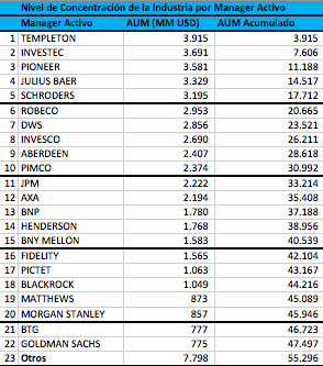 En el siguiente ranking, elaborado por Latam Pension Partners y que excluye el volumen invertido por las AFP en productos de gestión pasiva, se detalla cuál era la cuota de mercado que tenía cada una de las firmas a cierre del pasado mes de mayo, así como el patrimonio. En la segunda tabla se muestra la cuota de mercado y el volumen de activos únicamente de las gestoras internacionales.