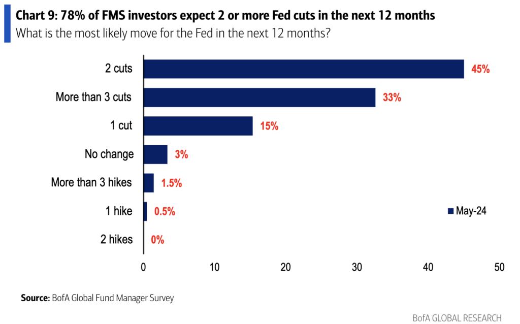 el 78% de los gestores esperan dos o más recortes de tipos por parte de la Fed en los próximos 12 meses (el 45% dice dos recortes, el 33% dice más de tres recortes).