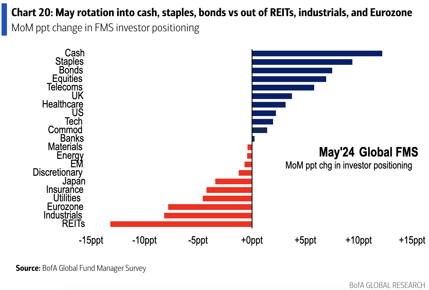 En mayo, los inversores aumentaron la asignación a efectivo, productos básicos, bonos y acciones mientras que redujeron la asignación a REITs, industriales, eurozona y servicios públicos.