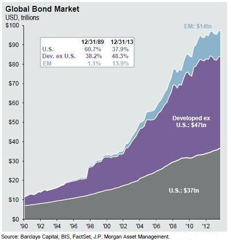 La deuda emergente, en cuanto a calificación, lleva un ritmo ascendente, con más subidas que bajadas de nivel y una ratio deuda/PIB crecientemente menor, al contrario de lo que ha sucedido en los últimos años con los países desarrollados. No es sorprendente que la inversión en este tipo de activo se haya incrementado tan notablemente (ver gráfico Global Bond Market).