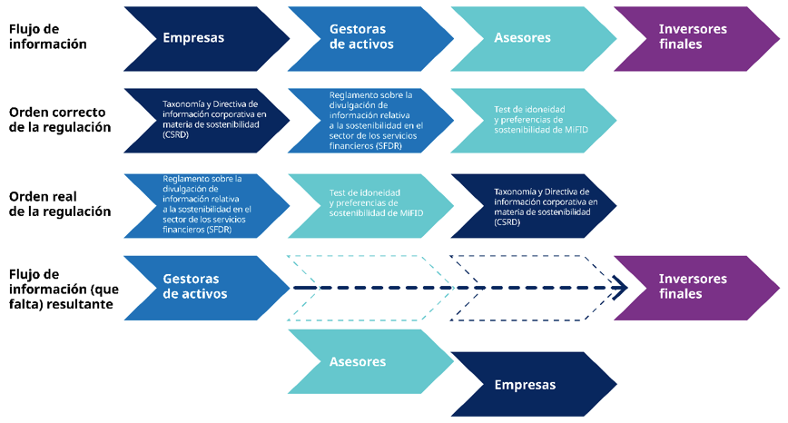 Sin embargo, ya en enero de 2022 deben informar de cuántos de sus productos cumplen la Taxonomía de la UE, que no está terminada, basándose en unos datos de cumplimiento de la Taxonomía por parte de las empresas que no existen. Asimismo, a partir de agosto de 2022, se supone que los asesores tienen que evaluar las preferencias de sus clientes a través de la información que les faciliten las gestoras de activos, que se basa en datos incompletos o, sencillamente, inexistentes.