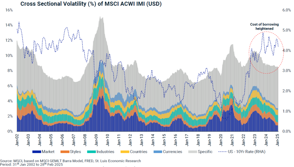 “Desde entonces, venimos observando el comportamiento contrario: aumenta el rendimiento del bono estadounidense y también aumenta la dispersión del mercado de renta variable”.