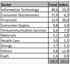 En cuanto al resto de sectores, continúa sobreponderando tecnologías de la información, consumo, salud y materiales de construcción, mientras que infrapondera energía. En el caso del consumo, el gestor cree que será el principal driver por su estabilidad y altos beneficios de calidad. Sigue estando sobreponderado, aunque recientemente ha reducido ligeramente esta posición. “Básicamente, lo que hemos hecho en el último trimestre es recoger beneficios en compañías de este sector y diversificar en compañías con un enfoque más exportador, que se benefician de sus bajos costes de producción y el abaratamiento del petróleo y de las materias primas. De todas formas, seguimos confiando en las compañías de este sector por la estabilidad y calidad de sus beneficios”.
