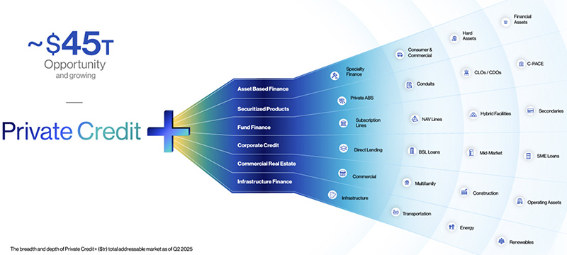 Este enfoque amplía de forma significativa el perímetro habitual del crédito privado, que suele asociarse casi exclusivamente al direct lending a empresas del middle market, un segmento cuyo tamaño se sitúa entre 1,5 y 2 billones de dólares. Bajo el marco de Private Credit+, el crédito privado incluye, además del crédito corporativo, la financiación respaldada por activos, los productos titulizados y el crédito estructurado, el crédito inmobiliario comercial, la financiación de infraestructuras y el fund finance. Se trata de segmentos diferenciados, con lógicas propias en términos de colateral, duración, liquidez y escalabilidad.