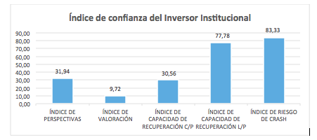 Recordamos que el valor del índice en el mes de octubre fue de 43,14; que se calcula como una media de cinco índices: índice de perspectivas, índice de valoración, índices de capacidad de recuperación a corto y a medio plazo y por último un índice de riesgo de crash y que dichos índices han sido reescalados para estar en el rango [-100; +100], siendo 0 el valor neutro. Por tanto los mejores escenarios corresponderían a los valores más altos del índice.