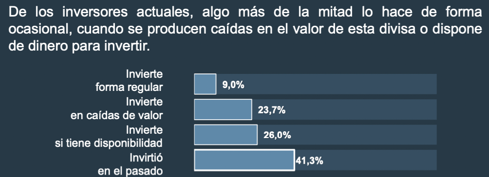 Pero aquellos que invierten tampoco lo hacen en grandes cantidades. La mayoría de los inversores invierte menos del 5% de su capital en esta clase de activo y algo más de la mitad lo hace de forma ocasional, cuando se producen caídas en el valor o dispone de dinero para invertir.
