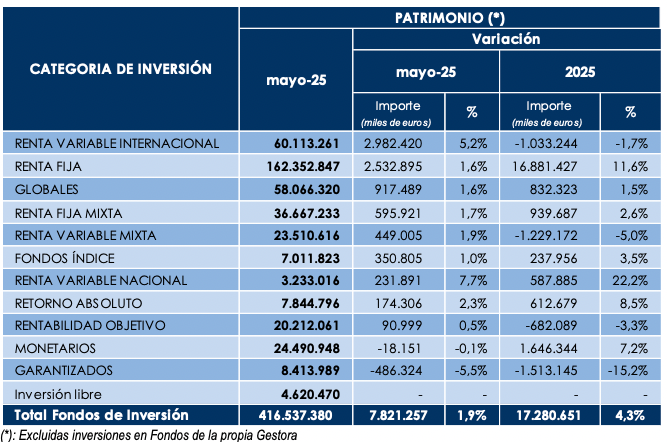Con el impulso de los mercados en el último mes, el patrimonio de los fondos se ha incrementado en 7.821 millones hasta alcanzar un nuevo máximo: los 416.530 millones. Hasta mayo, el incremento en el volumen de activos asciende a 17.280 millones (un 4,3%).