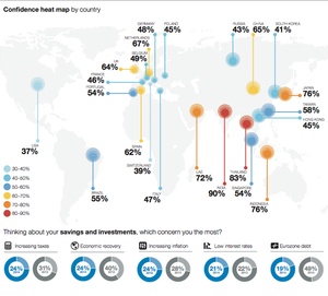 Aquí aparece otro de los datos significativos: en 2013, España era el tercer país más pesimista del barómetro, pues sólo un 30% de los inversores sondeados confiaban en sus oportunidades. En cambio, en 2014 la tasa se ha duplicado, puesto que un 62% de los españoles encuestados muestra mayor confianza en las oportunidades de inversión frente al 7% que afirma que su confianza es menor; se trata de una proporción superior a las medias mundial (56%) y europea (54%).