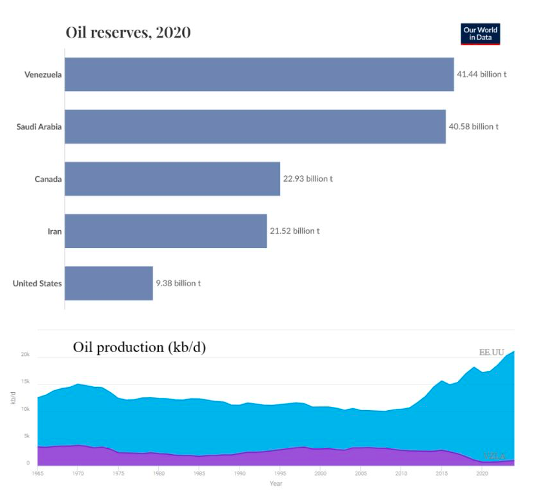 El gráfico inferior muestra la producción estadounidense, representada en área azul, frente a la producción venezolana, en área morada. La comparación refleja un claro desacoplamiento entre reservas y producción. Se trata de una anomalía entre las grandes potencias energéticas.