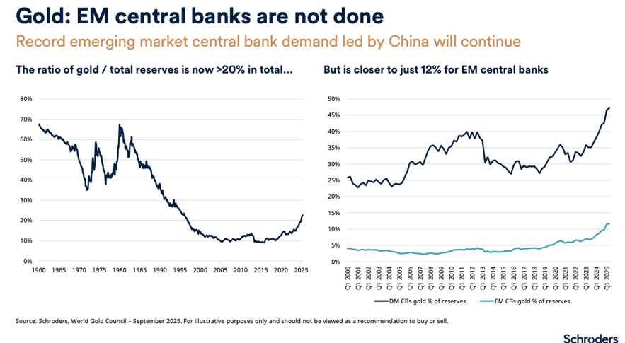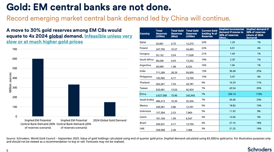 Matthew Michael, analista de materias primas de Schroders, señala que el impulso reciente no procede de los ETF ni del inversor minorista. El avance está liderado por bancos centrales de mercados emergentes, con China como protagonista destacado. La presentación ilustra cómo un aumento de reservas hacia el 20% o el 30% generaría una demanda equivalente a varios años del mercado global, algo que tensionaría aún más el equilibrio actual. El experto recuerda que dos tercios de las compras oficiales no se reportan de forma pública, lo que amplifica su impacto.