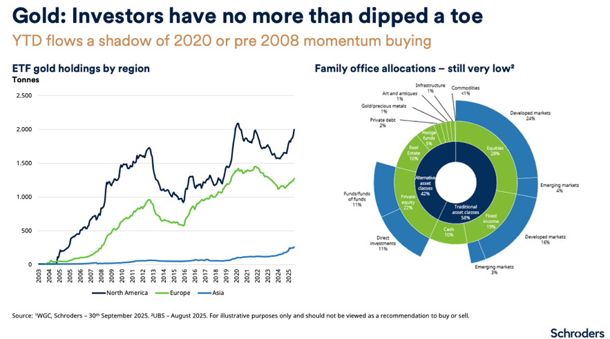 El quinto elemento aporta una dimensión adicional al análisis. Los inversores occidentales han mantenido posiciones muy reducidas durante el rally. Los ETF en Europa y Norteamérica registraron incluso salidas, pese al avance del precio. La presentación muestra que las family offices también mantienen una asignación mínima a oro y metales preciosos.