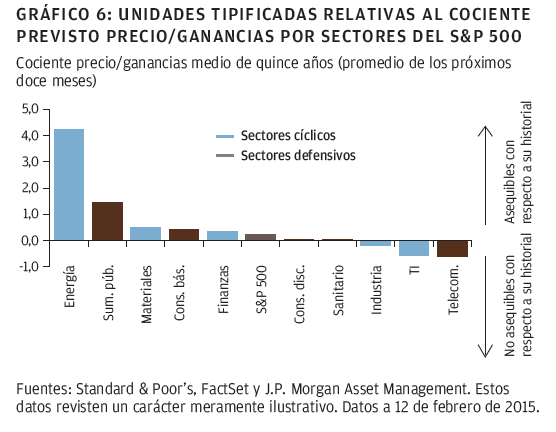 Dichos factores han incidido en los diversos sectores de manera diferente, lo cual brinda oportunidades de inversión a largo plazo. “Concretamente, los sectores cíclicos (donde se incluyen tecnología, industria y consumo discrecional) parecen presentar precios atractivos. Por lo general, es de esperar que estos comiencen a arrojar resultados positivos a medida que la economía estadounidense prosiga su crecimiento. Ello queda patente en el rápido crecimiento de las ganancias de estos sectores. Por otra parte, dado el impulso que ofrece al consumo el descenso de los precios de la energía —que tratamos más detalladamente a continuación—, se espera un crecimiento fuerte del beneficio por acción en el sector de consumo discrecional”.