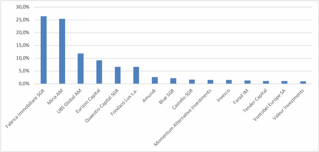 Se si guarda, nel dettaglio, alle società di gestione, come facilmente intuibile data l’ampiezza prevalente della quota immobiliare, due società si spartiscono la maggior parte degli attivi. Si tratta di Fabrica Immobiliare SGR, che gestisce oltre il 52% degli asset immobiliari e il 26,4% degli asset totali, e Miria AM con il 38,30% degli asset immobiliari e il 19,4% di quelli totali. Quest’ultima società di asset management e consulenza, è stata acquisita nel 2024 da Enasarco “che ha fatto confluire qui alcuni fondi”, spiegano ancora gli esperti. Miria, che nell’immobiliare investe in “strategie di private equity value-add su asset immobiliari in Europa”, detiene anche un mandato azionario che va a incidere sul 69,5% del totale dei mandati in questa precisa classe di attività. Sul fronte obbligazionario, la parte del leone è in capo a Fondaco Lux che detiene oltre il 77% della quota gestita in questa asset class.