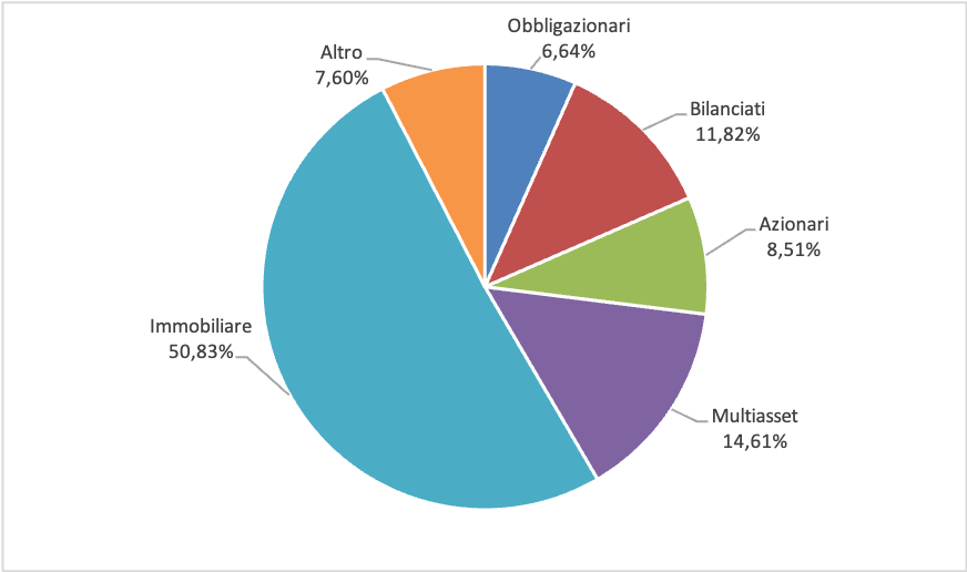 Da punto di vista delle attività, “i comparti di SICAV di diritto lussemburghese sono utilizzati principalmente per la gestione del patrimonio immobiliare e della parte liquida del portafoglio” specificano da Itinerari Previdenziali. Nello specifico emerge che quasi il 51% (5,26 miliardi) sono investimenti immobiliari, seguono i multiasset con il 14,61% (1,51 miliardi), i bilanciati con l’11,82% (1,22 miliardi) gli azionari all’8,51% (880 milioni), gli obbligazionari al 6,64% (687 milioni) mentre un 7,60% è classificato come “altro” (786 milioni).