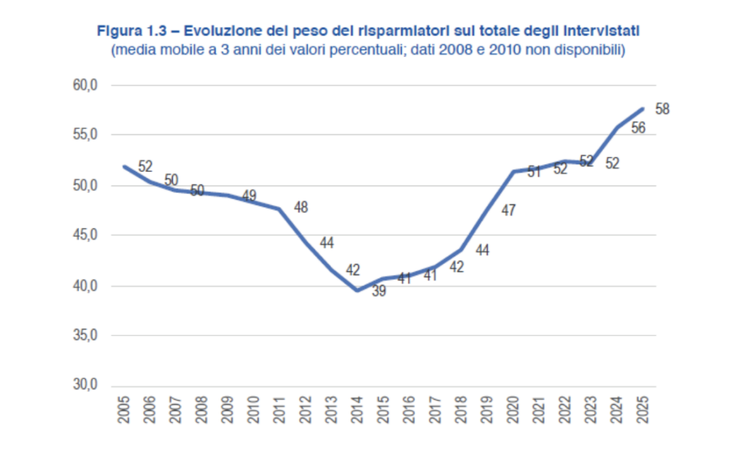 L’indagine, condotta su un campione di circa 1.500 individui possessori di conto corrente coinvolti nella scelta finanziaria della famiglia (di cui 800 silver age), vede come dato più interessante l’aumento della quota dei risparmiatori sul totale degli intervistati, arrivati al 58%: valore più elevato degli ultimi 20 anni (il minimo era stato nel 2014, con il 39%), in aumento rispetto sia al 2023 (52%) sia al 2024 (56%). “Numeri importanti perché rapportati alla popolazione significano l’inclusione di 500 mila famiglie in più”, afferma Giuseppe Russo, direttore Centro Einaudi. Alta anche la percentuale di reddito risparmiata, all’11,5% ma resta ferma (nel 2024 era pari all’11,7%). Il dato è anche determinato dall’aumento dei risparmiatori, che apportano alla quota totale del risparmio anche capacità reddituali (e quindi di accantonamento) inferiori. Tuttavia questo slancio definisce come il risparmio di confermi, come indicato da Giuseppe Lavazza, presidente del Centro Einaudi “una virtù sociale, coltivata da generazioni e che negli ultimi anni si sta consolidando”.