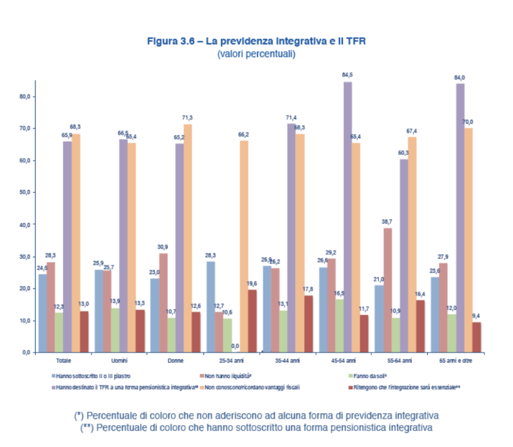 Un elemento interessante rimanda alla previdenza integrativa che, per quanto sia presente per un 24,5% di risparmiatori (quota duplicata negli ultimi 15 anni), è ancora insufficiente per far fronte allo iato in termini di benessere che attende le attuali generazioni al momento del ritiro dall’attività lavorativa. La maggior parte della previdenza è stata realizzata accantonando il TFR e tra quanti non ce l’hanno il motivo è che “non avrebbero la liquidità per garantirla” (il 28%). Resta invece bassa la diffusione di polizze Long Term Care (LTC), ma anche sanitarie e vita (specie tra i giovani): soltanto il 17,9% degli intervistati.