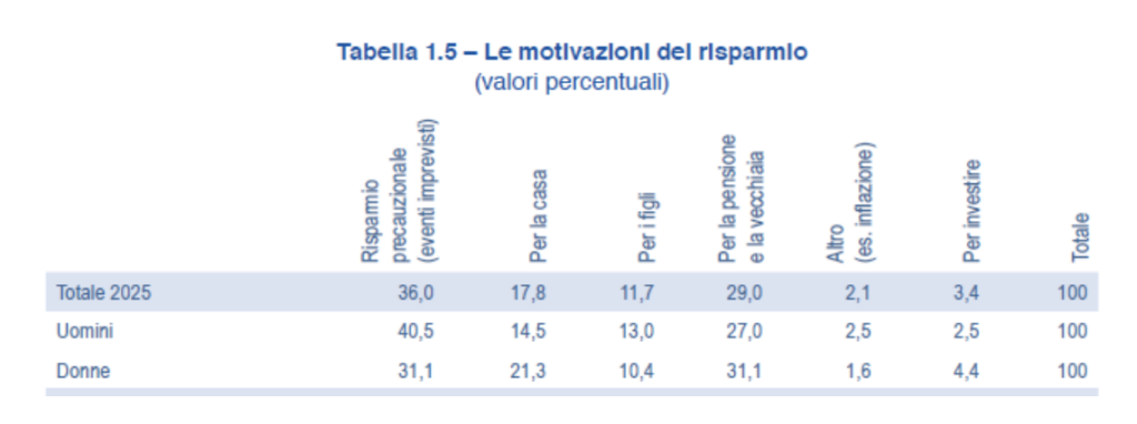 Ancora una volta lo studio conferma che risparmiano principalmente gli uomini (61% contro il 57% delle donne) e le persone con un maggiore livello di istruzione. Per il 36% degli intervistati le risorse accantonate servono ad affrontare imprevisti futuri (cosiddetto “risparmio precauzionale) ma, accanto a questa, si consolida una nuova categoria di risparmiatori "intenzionali” che pianificano strategicamente obiettivi precisi di accumulazione (casa, figli, età della pensione) e rappresentano il 38% dei risparmiatori.