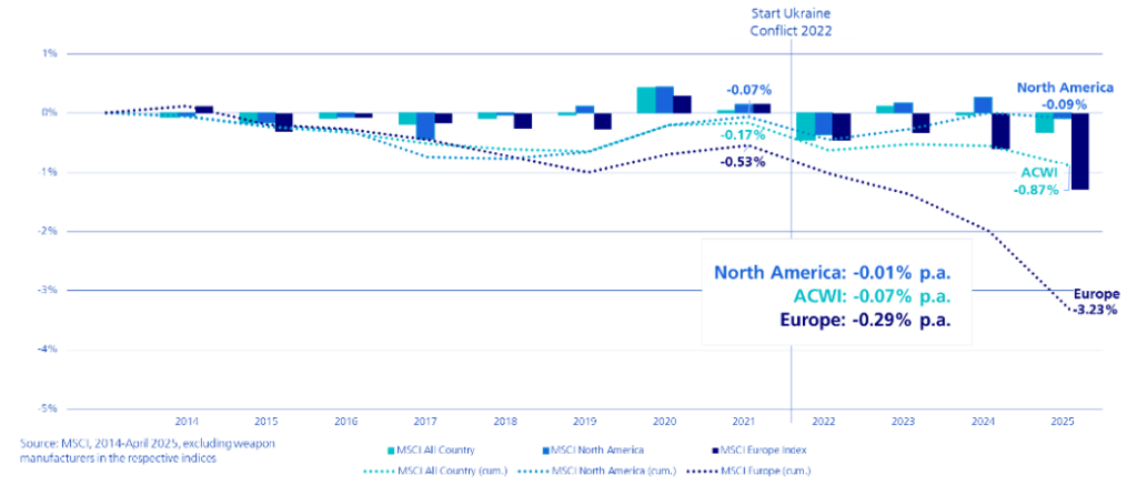 Similmente, l’esclusione del settore della difesa, tema tornato centrale con la guerra in Ucraina, ha avuto un impatto trascurabile sulle performance globali: dal 2014 al 2025, la perdita annua netta è stata dello 0,04%. Anche in Europa, dove il settore ha registrato un rimbalzo, la penalizzazione resta contenuta (-0,60% annuo rispetto al MSCI Europe). Questi dati mostrano che l’idea secondo cui “evitare certi settori” penalizzerebbe automaticamente la performance non trova riscontro su orizzonti più ampi.