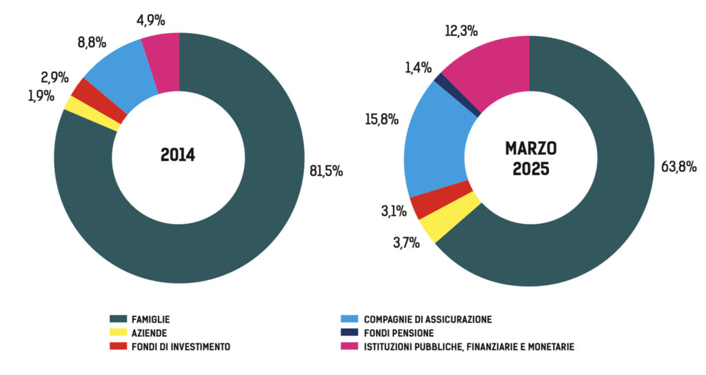 Tuttavia, le famiglie hanno perso terreno in termini relativi: nel 2014 detenevano l’81,5% degli AuM investiti in fondi domestici, mentre nel 2025 la percentuale era scesa al 63,8% del totale. Le masse provenienti da investitori istituzionali sono invece aumentate in misura proporzionalmente maggiore, da 45 a 150 miliardi, sospinte principalmente dal contributo delle compagnie assicurative (dall’8,8 al 15,5%, ancora una volta dovuto allo sviluppo del mercato delle polizze unit linked e previdenziali), delle aziende (dall’1,9 al 3,7%) e delle istituzioni pubbliche, finanziarie e monetarie (dal 4,9 totale al 12,3%). “Nel corso di quei dieci anni, la quota di mercato delle bancassicurazioni è cresciuta sensibilmente: una parte significativa del risparmio privato che in passato sarebbe stata investita direttamente in fondi oggi confluisce nelle polizze unit-linked”, commenta Alberto Data, responsabile della divisione di Dublino di Intesa Sanpaolo Assicurazioni. In altre parole, ci sarebbe un effetto sostituzione a vantaggio delle polizze unit linked: contenitori che hanno spiazzato parte degli investimenti diretti in fondi dei privati.