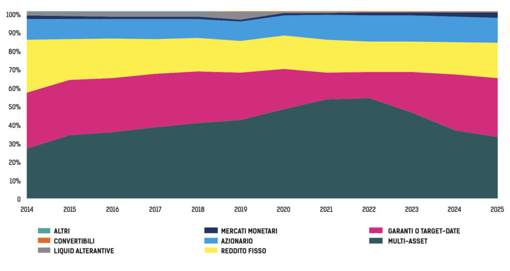 Analizzando nel dettaglio un segmento più ristretto, ovvero il mercato dei fondi comuni italiani, spicca la significativa inversione di tendenza dei prodotti multi-asset. Tra il 2014 e il 2022 questa categoria di fondi aveva raccolto più masse di tutte le altre, passando dal 27% a più del 40% del totale degli AuM; per poi perdere, nei soli tre anni successivi, buona parte del terreno guadagnato in precedenza, ritornando a poco più del 30 per cento. Nel 2022 l’aumento significativo dei tassi “ha causato sconcerto tra gli investitori retail che venivano da 10 anni di politiche monetarie accomodanti. Il risultato è che molti si sono temporaneamente disaffezionati alle strategie multi-asset, preferendo migrare, dal 2023 a oggi, verso fondi monetari con durata più bassa, e verso prodotti a rendimento garantito”, commenta Francesco Sandrini, CIO di Amundi SGR. Negli anni seguenti, però, la buona performance dei mercati azionari ha in parte contribuito a cambiare il sentiment degli investitori, convincendoli a mantenere o rinforzare l’allocazione verso gli asset rischiosi. Quello cui si assiste oggi, dunque, è un “ricorso a strumenti multi-asset in forma molto differente che in passato. La domanda verso i fondi di investimento è stata surrogata da gestioni individuali ed ETF, tutti strumenti per cui le banche possono rivestire un ruolo molto importante e più diretto”, aggiunge Sandrini.