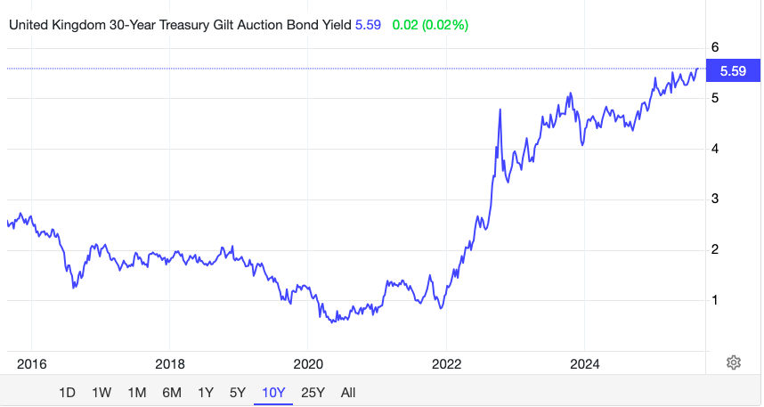 O rally das yields dos gilt reflete um custo de financiamento estruturalmente mais elevado para o Reino Unido, condicionado tanto pela perceção de fragilidade fiscal quanto pelo volume de emissão de dívida. Recentemente, a yield dos gilt a 30 anos atingiu 5,6%, um nível que não era visto há quase três décadas. Esta escalada reforça a perceção de risco nos prazos longos.