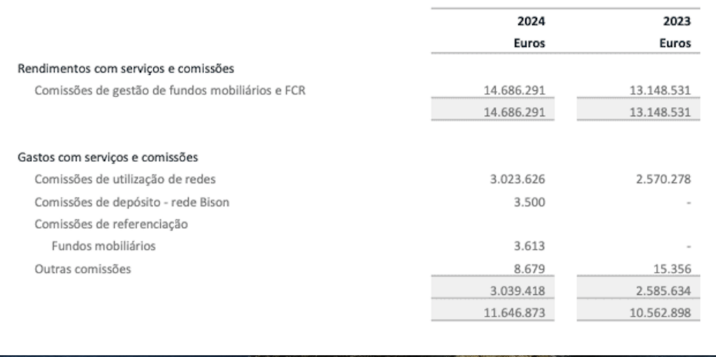 Ao nível das comissões cobradas pela sociedade aos fundos, a entidade regista que estas "aumentaram 12% relativamente ao ano anterior". Conforme visível abaixo, atingiram um valor de 14,6 milhões de euros no período. Nos gastos com serviços e comissões, que abrangem os distribuidores e depositários, a entidade registou um aumento desses gastos para os 11,6 milhões de euros. Justificam que "em 2024 foi registado um aumento das comissões de comercialização, em conformidade com os termos contratualmente definidos referente ao desempenho dos distribuidores".