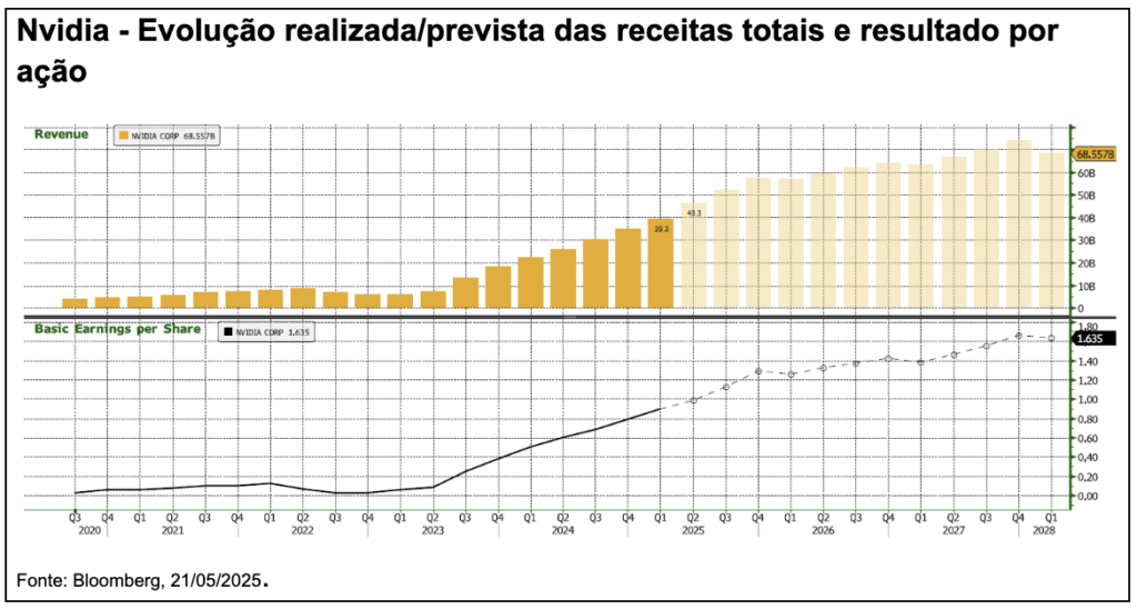 Para o primeiro trimestre de 2025, o consenso de mercado antecipa receitas na ordem dos 43,3 mil milhões de dólares, dos quais cerca de 90% são relativos ao segmento de data centers, um aumento de 66% face ao mesmo período do ano anterior e de 10% face ao último trimestre, com um lucro por ação estimado em 0,88 USD. A confirmar-se, será mais uma demonstração da força da procura por soluções computacionais de elevada performance, sobretudo no domínio da inteligência artificial generativa.