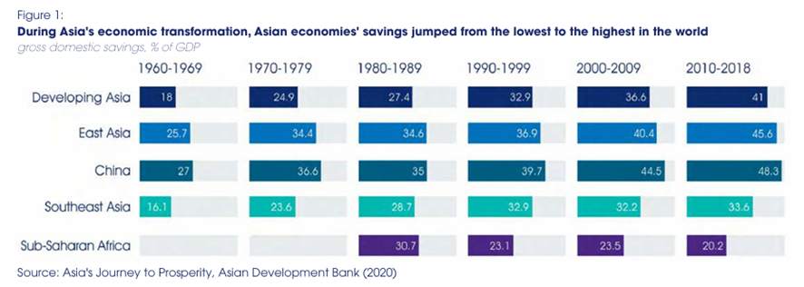 Entre as décadas de 1960 e 1970, muitos destes países duplicaram a sua poupança interna em parcela do PIB e continuaram a aproveitar esse impulso — culminando em taxas médias de poupança que ultrapassam os 40% do PIB atual, entre as mais elevadas do mundo.