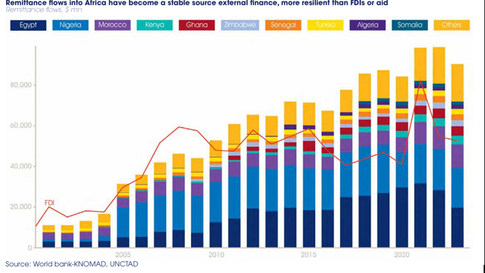Em 2024, África receberá mais de 95 mil milhões de dólares em remessas da sua diáspora global — um valor aproximadamente equivalente ao total de entradas de IDE para o continente nesse ano.