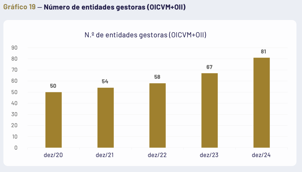 Quanto ao número de entidades gestoras que desenvolvem a atividade de gestão de ativos, a evolução tem sido diferenciada. “No que toca à gestão individual de carteiras, o número de entidades gestoras tem-se mantido estável e ligeiramente acima das três dezenas”. Por sua vez, acrescentam, o número de entidades gestoras de OICVM e OII tem subido. “Esse aumento foi mais expressivo entre as entidades gestoras de OII, nas quais se registou um acréscimo de 25 operadores entre 2020 e 2024 (seis no caso dos OICVM, no mesmo período)”, afirmam.